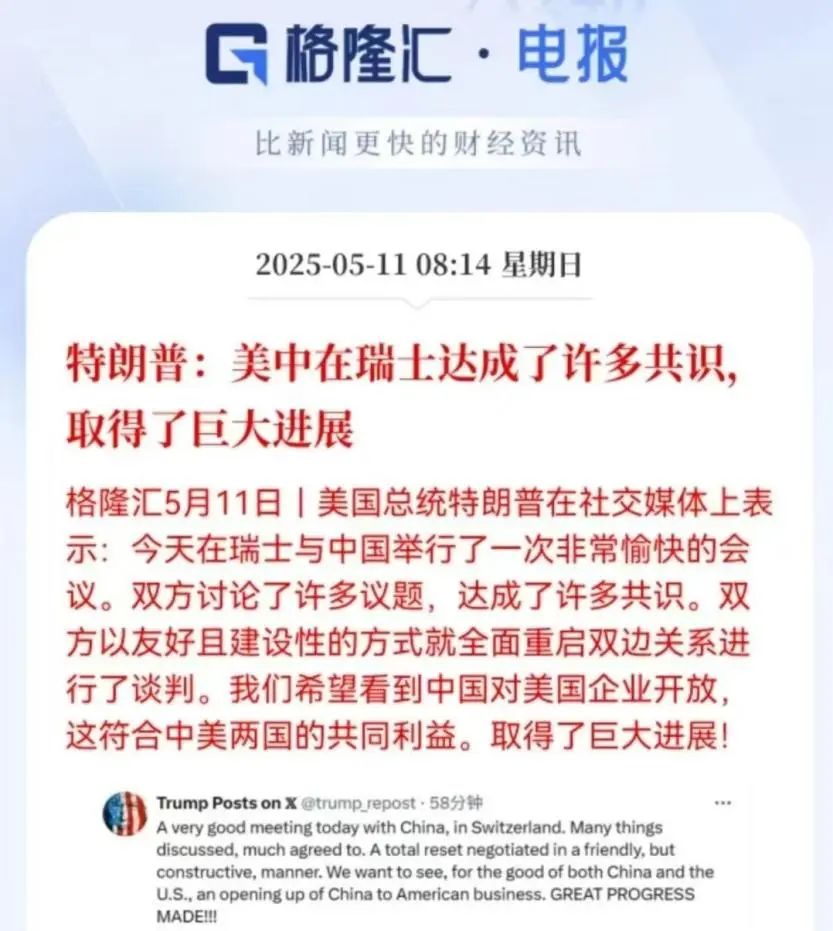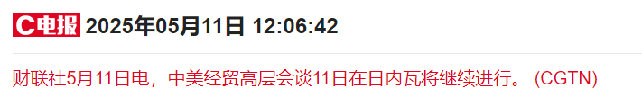首先是关税,最新的消息是双方还在日内瓦继续谈。早上特朗普发了一条消息,说中美在瑞士达成了许多共识,取得了巨大进展,特朗普的话可信度存疑,具体还是等谈判结束后双方的通告。