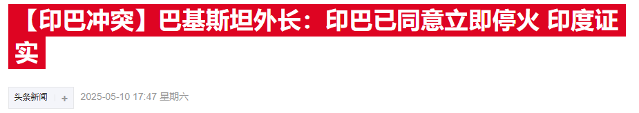 印度外交秘书唐勇胜证实,印巴已同意停火。唐勇胜表示,巴基斯坦军事行动总指挥于10日15时35分致电印度军事行动总指挥。双方达成一致,自印度标准时间17时起,双方将停止陆、海、空一切交火和军事行动。当天稍早时,巴基斯坦副总理兼外长达尔表示,巴基斯坦和印度已同意立即停火。