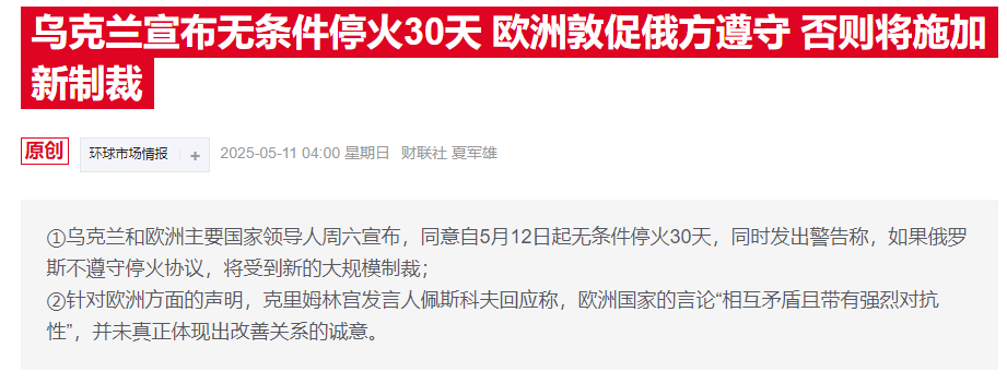 乌克兰和欧洲主要国家领导人周六宣布,同意自5月12日起无条件停火30天,同时发出警告称,如果俄罗斯不遵守停火协议,将受到新的大规模制裁。